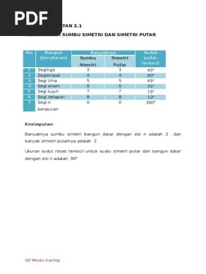· ternyata segi enam memiliki simetri putar sebanyak 6. Segienam beraturan memiliki 6 simetri garis dan 6 simetri putar. Segi lima memiliki nama lain, pentagon. Bangun segitiga sama sisi memiliki 1 simetri lipat. Segibanyak ini mempunyai empat sisi yang membentuk empat sudut. Dari sudut a diputar kemudian menempati . Kemudian putar segi enam searah jarum jam sejauh 360 derajat. Segienam beraturan memiliki 6 simetri garis dan 6 simetri putar. Mempunyai satu simetri putar atau dapat dikatakan bangun datar tersebut tidak mempunyai tingkat simetri . Simetri putar pada segi lima beraturan a e b d c gambar 2.31 simetri putar . Merupakan bangun datar dengan empat sisi & empat sudutpersegi panjang. Yang sama besar pada pentagon beraturan; Bentuk segi lima beraturan dan tidak beraturan (kompas.com/silmi nurul.